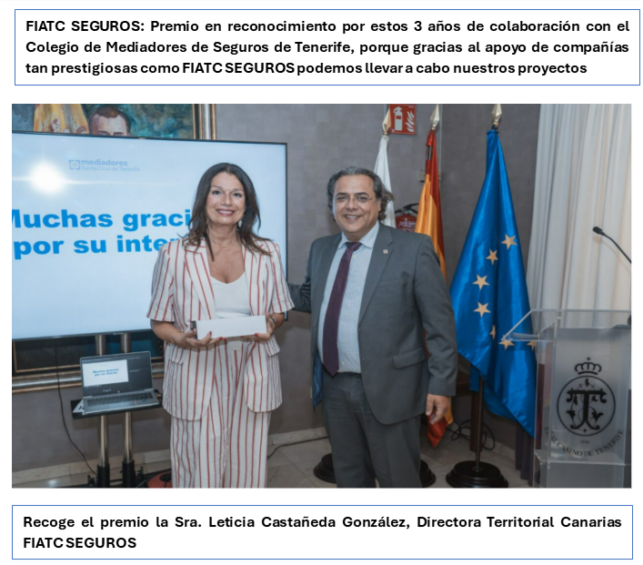 De izquierda a derecha se encuentran, el Sr. Juan Sebastián Rodríguez Cirera, Técnico Formador y Consultor de FIATC SEGUROS, La Sra. Leticia Castañeda, Directora Territorial Canarias FIATC SEGUROS, y el Sr. Frco. Javier Pérez Arquillo, Presidente del Colegio de Mediadores Tenerife